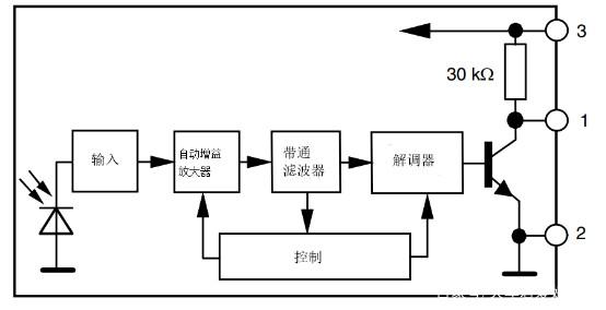 如圖是接收頭內(nèi)部結(jié)構(gòu)方框圖,內(nèi)部集成了自動增益放大器、帶通濾波器、解調(diào)器等電路,有些還包含限幅電路、比較器以及積分器等,因此一個小小的接收頭其實內(nèi)部集成了不少電路。