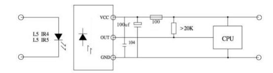 如下圖是紅外接收頭應(yīng)用原理圖,由于接收頭很容易受到外界信號干擾,特別是紅外光,因此在接收頭的供電兩端加上濾波電容,也就是說在VCC與GND之間并聯(lián)接一個電解電容以及瓷片電容,容量大小可根據(jù)藍(lán)晉光電廠家提供數(shù)據(jù)設(shè)計的即可;同時在輸出引腳上拉一個電阻,使信號更穩(wěn)定;VCC輸入串聯(lián)一個電阻,與電容組成RC,同時也起到限流降壓作用,進一步加強接收頭穩(wěn)定性。