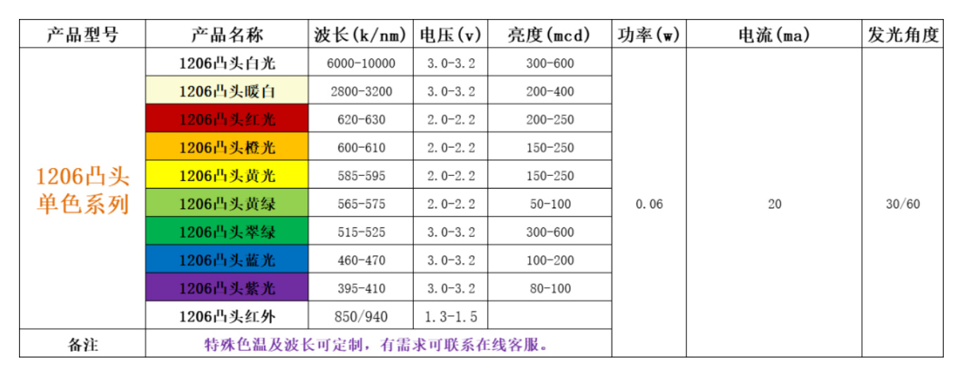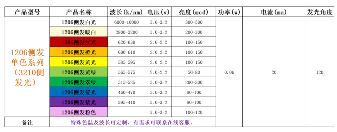 1206側(cè)發(fā)燈珠雙色、三色RGB參數(shù):