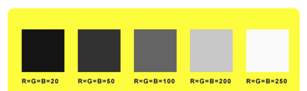 3個(gè)數(shù)字都為0,相當(dāng)于3盞燈都沒打開,一片漆黑,就是“黑色”。三個(gè)顏色數(shù)量相同時(shí),無色相,顯示為灰色,隨著數(shù)量的增加,由深灰變?yōu)闇\灰。